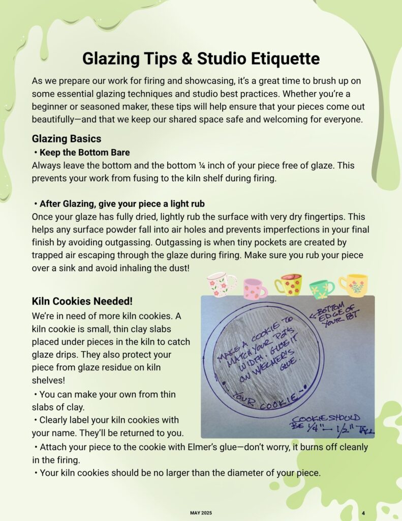 As we prepare our work for firing and showcasing, it’s a great time to brush up on some essential glazing techniques and studio best practices. Whether you’re a beginner or seasoned pro, these tips will help ensure that your pieces come out beautifully, and that we keep our shared space safe for all.