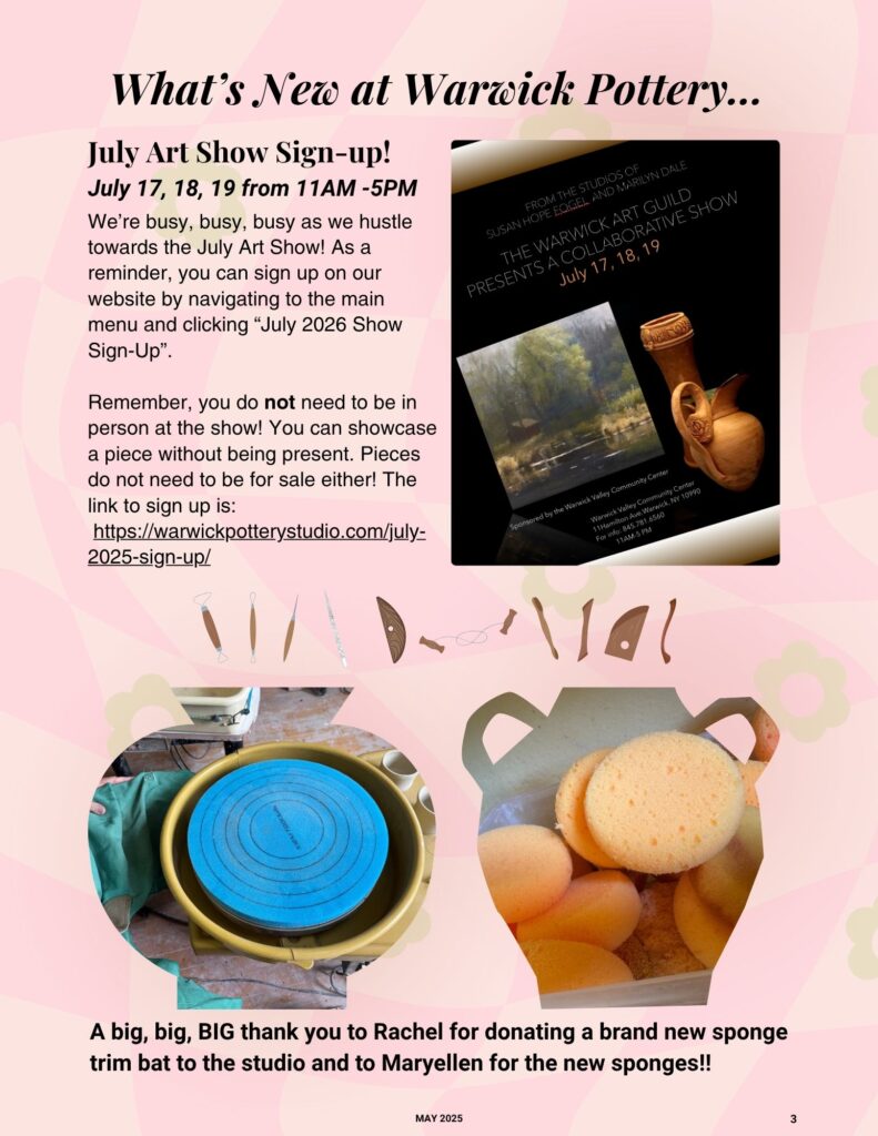Marilyn is accepting submissions of your pottery for the show. You do not need to be present at the event to participate. To submit your work, please text photos of your pottery—pieces made at Warwick Pottery—directly to Marilyn by June 24, 2025. Send as many pictures as you like! Marilyn will carefully select a small number of pieces to be exhibited.